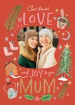 Features illustrative style Christmas related items such as hot chocolate, snowflakes, Christmas tree and a candy cane. In the centre is a photo upload with text around it in a mixed style of hand written fonts.