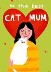 This design is heartwarming and playful, featuring an illustration of a smiling woman holding a white cat. The woman, wearing a yellow striped jumper, has her eyes closed in contentment while cuddling her feline friend. Behind her is a large red heart with the bold white text, “CAT MUM,” prominently displayed. Above the heart, in smaller white letters, the message reads, “to the best.” The background is a soft green, with small red hearts scattered around, adding to the loving tone of the card. The design is charming and colourful, celebrating the bond between a cat mum and her pet.