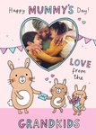 A sweet Mother’s Day card from the grandkids, featuring a heart-shaped photo upload area, adorable illustrated rabbits, bunting, and pastel hearts on a soft pink background.