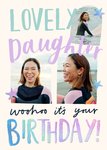 Features three photo upload areas on a white background, surrounded by hand written style text in a mix of pink, teal, lilac and foil effect colours.