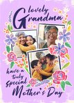 Featuring a collage of three photo frames decorated with illustrated flowers on a purple background.