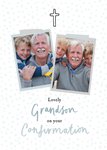 Front of card: Pastel Teal and Grey coloured polka dots surround two photo frames, featuring a cross above the frames. Text is underneath the frames at the bottom of the card. Text reads: "Lovely Grandson On Your Confirmation".