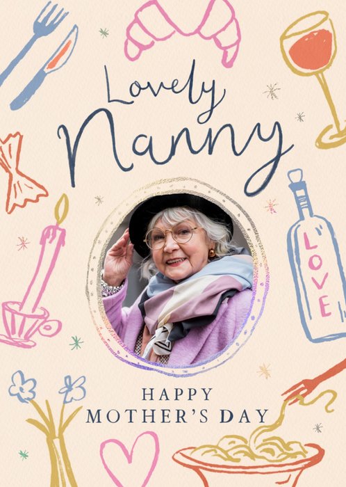 A warm and elegant Mother’s Day card for a nanny, featuring a textured cream background with hand-drawn illustrations of food, flowers, and wine. A circular photo upload area is at the centre, framed with delicate gold accents.