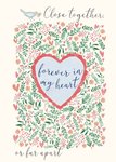 A sweet and affectionate Valentine's Day card featuring a watercolour illustration of a love heart with scalloped edges with a light blue ribbon wrapping around it, the heart is surrounded by flowers, vines with leaves and little red love hearts.