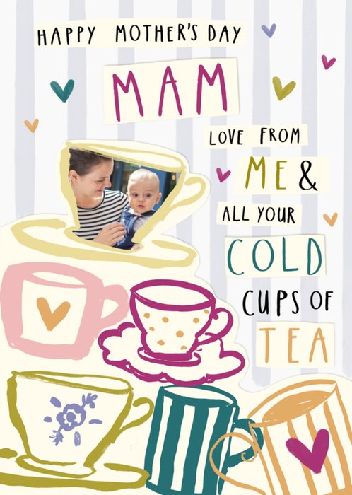 A heartfelt Mother’s Day card for Mammy featuring a playful tea theme with illustrated teacups and a customisable photo. The text references the many cold cups of tea Mams endure, making it a relatable and charming card.