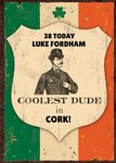 Front of card: 'Coolest Dude' Birthday Card Illustration of a man in a plaid suit and a bowler hat in a shield shape with an Irish flag on a rustic metal background. Text reads: "38 today Luke Fordham" and "Coolest dude in Cork!". '38 today Luke Fordham' and 'Cork!' can be personalised!