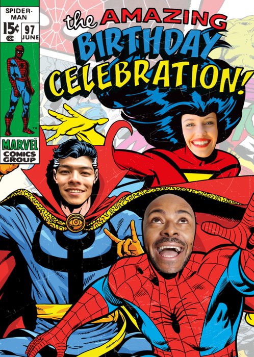 Featuring a retro illustration of Dr Strange, Spider-Man and Spider-Woman with face upload frames.