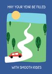 Featuring a simple, stylistic illustration of a car driving up a winding road going up a hill, there are trees on either side of the road and a big yellow sun in the sky.