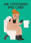 A bold and humorous card featuring an illustration of a woman sitting on a toilet, scrolling on her phone. The background is a vivid lime green, and the style is modern and quirky. Ideal for sending a cheeky message to a friend or loved one with a sense of humour.