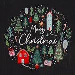 Featuring festive illustrations in the shape of circle on a black chalkboard background.