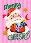 Featuring a bold and colourful illustration of Santa Claus holding a stack of wrapped presents with bright ribbons. The design sits on a pink striped background with gold stars and a red crescent moon. The festive text is written in large green hand-drawn lettering.