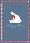This classic Cath Kidston Christmas design features an elegant blue background with an illustration of a polar bear wearing a festive red bow. Below the illustration is a hand-written Christmas message and the design has a wavy ribbon border.