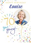 Balloon shaped photo upload card with a border of varying colour with large gold 70