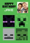 Front of card: Minecraft Character Heads Photo Upload Birthday Card Minecraft Creeper, Zombie, Skeleton and Enderman heads. Text reads: "Happy Birthday Jake". Jake is customisable