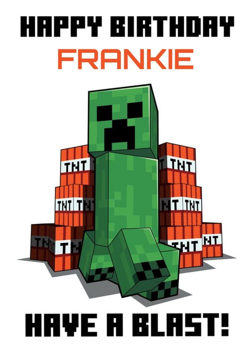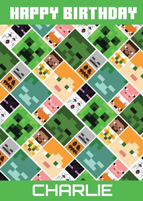 Front of card: Minecraft Characters Personalised Birthday Card Minecraft characters block pattern. Text reads: "Happy Birthday Charlie". Charlie is customisable