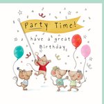 A sweet and fun Birthday card featuring four illustrated cheerful mice wearing party hats, jumping around, dancing with excitement. One of them is holding up a banner flag and two of them are holding party balloons, with one balloon floating in the air. There is also confetti bursting around in the background.
