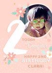 Hooray For Today. Front of card: Pink background with circular photo frame bottom with illustrated multi coloured flowers with a large number 2 in the top left. Photo upload in the top right of the card. Text on the card reads: "2 Today Daughter, Happy 2nd Birthday Clara!". All text is besides 2 and Birthday is editable. Back of card contains: Hooray for Today logo in matching style.