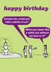 Front of card: Featuring a cartoon style illustration of two people stood in front of a water fountain holding a camera asking a stranger to take a picture. There is large 'happy birthday' text at the top of the card.