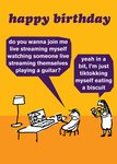 Text reads: "Do you wanna join me live streaming myself watching someone live streaming themselves playing a guitar?" "Yeah in a bit, I'm just tiktokking myself eating a biscuit."