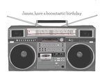 Modern trendy retro illustrated design with a ghettoblaster and type font card.Text reads: "James, have a boomtastic birthday". James, have a boomtastic birthday can be personalised.