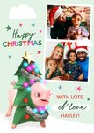 Cute Moonpig Wearing a Christmas tree outfit. Personalised card. Text reads: "Happy Christmas With lots Of Love Harley!"