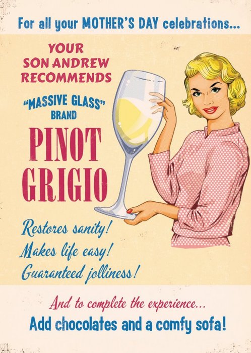 Mother's Day Card - Mum - Wine - Pinot Grigio - Funny Retro Card