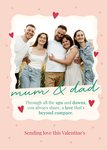 "Mum & Dad through all the ups and downs, you always share, a love that's beyond compare. Sending love this Valentine's". 'Sending love this Valentine's' can be personalised!