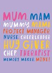 Mum Project Manager Nurse Cheerleader Hug Giver Chef Therapist Memory Maker Handwritten Typography Mother's Day Card