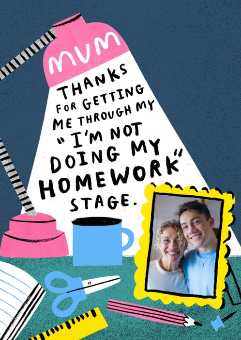 A humorous and relatable Mother's Day card featuring an illustrated desk setup with stationery, a cup, and a framed photo upload area. This card is perfect for expressing gratitude to Mum for all her patience and support during school days.