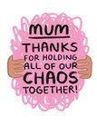 A humorous and heartfelt Mother's Day card featuring a hand-drawn illustration of a pink scribble being held together by hands, symbolising the chaos Mum manages every day. The bold, playful typography adds a fun touch to this appreciation card.