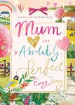 Front of card: Featuring an illustration of a beautiful country side surrounding a text frame filled with colourful typography. Text reads: "Happy Mother's Day mum you are absolutely perfect in everyway".
