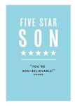Features white and black text on a blue background. Text reads "Five Star Son. You're Son-Believable!"