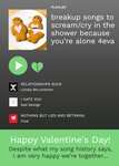 Funny Valentine's card that looks like a music streaming playlist, featuring 4 optional photo uploads. The optional photo upload features a pair of gingerbread people with hearts on their chests, and one is broken in two. The following three optional photo uploads are icons of a skull and crossbones, a sad face, and a broken heart. These optional photo uploads can be kept on the card.