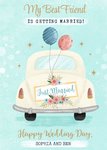 Front of card: Features an Illustration of a Car with Just Married Sign with text above and below. Text reads: "My Best Friend Is Getting Married Happy Wedding Day Sophia and Ben". 'Names can be personalised!