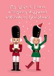 Front of card: Featuring an illustration of nutcracker characters one singing while the other not looking so impressed. Text reads: "My wife & I have a slightly different attitude to Christmas!".