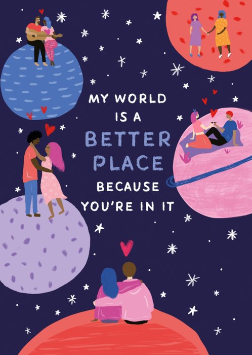 Featuring an illustration with a dark blue, starry background, shows various couples on colourful planets, expressing affection in different ways.