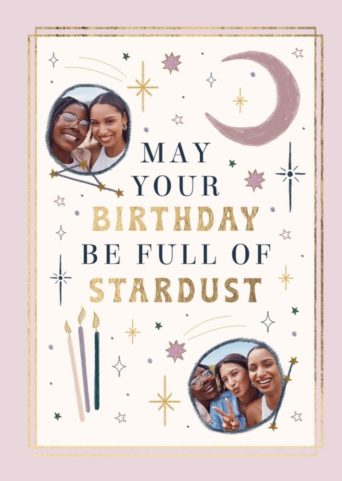 An astrological and magical Photo Upload Birthday card featuring hand-drawn illustrated stars, a crescent moon, a shooting star, candles, a mystical eye and a crystal surrounding the central text, a couple of the words are in a gold foil effect. There are two photo upload areas inside of circles.