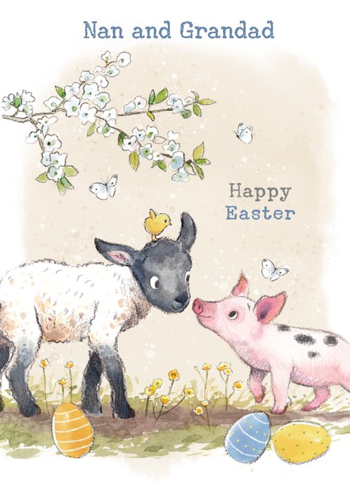 Featuring a watercolour style lamb and piglet facing each other with a small chick, butterflies, blossom, and painted eggs on a greeting card, set on a speckled pale beige background.