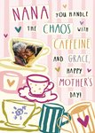 A charming Mother’s Day card for Nana with a tea and coffee theme. Featuring playful typography, teacup illustrations, and a space for a personal photo, this card highlights the chaos and love that comes with being a grandparent.