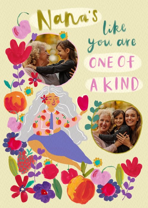 A heartfelt and beautifully illustrated card for Nana featuring a floral and fruit-themed design with an artistic illustration of a woman holding a heart. The card includes a warm beige background with a space for personalised photos, making it extra special. A thoughtful way to celebrate a one-of-a-kind Nana and show appreciation for her love and care.