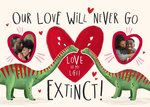 Features an illustration of two Diplodocus dinosaurs in love, with a big central heart, and two heart shaped photo upload frames for your photos.