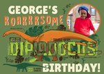Front of card: Natural History Museum Diplodocus Photo Upload Birthday Card Illustration of a Diplodocus with fun facts. Text reads: "George's roarrrsome Diplodocus birthday". 'George's' can be personalised!