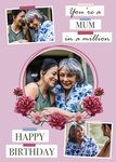 Front of card: Natural History Museum Mum's Photo Upload Birthday Card Three photo frames one with flowers on a pink background. Text reads: "You're a mum in a million happy birthday".