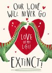 This fun and romantic greeting card from Natural History Museum features two illustrated dinosaurs forming a heart shape with their necks, surrounded by a large red heart and playful typography, expressing love that will never go extinct.