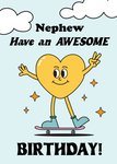 The greeting card features a playful cartoon heart character riding a skateboard, giving a peace sign, with stars around it. The bold text “Nephew, Have an awesome Birthday!” is written above and below the character, set against a light blue background with fluffy white clouds.