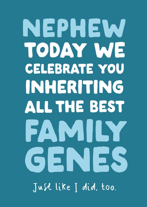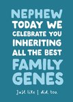 This playful greeting card features bold, colourful typography that celebrates a nephew, highlighting their special qualities and humorous family traits, with a whimsical touch from the concluding line.