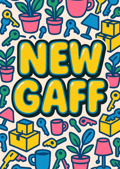 Featuring bold yellow lettering reading “New Gaff” surrounded by a colourful pattern of illustrated house keys, moving boxes, potted plants, mugs and table lamps. The playful icons are arranged across a soft cream background in vibrant shades of blue, pink, yellow and green.