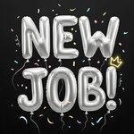 Featuring silver balloon lettering spelling out a new job message, with colourful confetti and a small crown doodle on a black background.