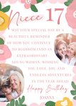 "Niece, 17. May your special day be a beautiful reminder of how you continue to blossom into an extraordinary young woman. Wishing you love, joy, and endless adventures in the year ahead. Happy Birthday Joanna."