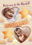 Front of card: Illustration of stars and clouds with two heart shaped photo uploads and text on a orange and gold glitter striped background. Text reads: "Welcome to the world! Olivia Liam. Gorgeous Twins!". Editable names.